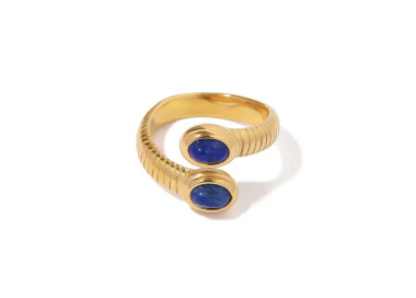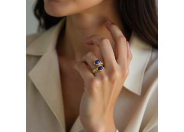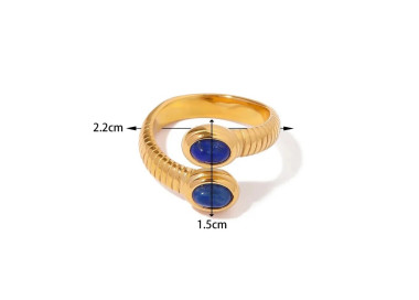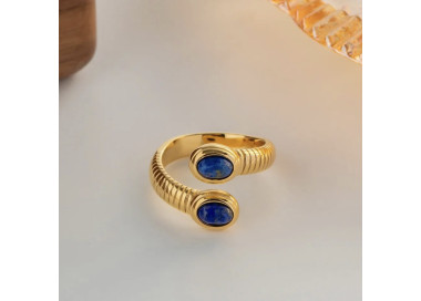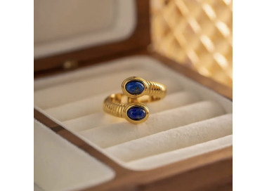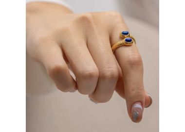Ela es un anillo en forma ovalada con dos piedras naturales de Lapislázuli, es un anillo muy exclusivo y elegante, es una joya original y divertida.