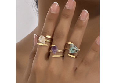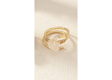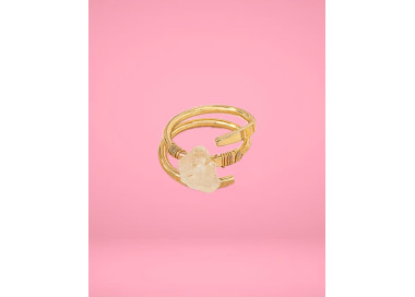 Este anillo destaca por su geometría irregular, es una joya elegante, original y divertida. Diseñado con piedras naturales de Cuarzo Blanco, sin níquel, sin plomo, de material hipoalergénico de máxima calidad para pieles sensibles, esta ensamblado a mano.