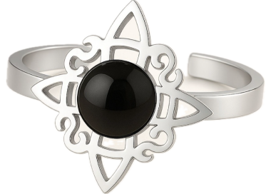 Elegancia misteriosa en acero inoxidable La combinación del negro profundo de la piedra con el brillo plateado del acero crea un contraste visualmente impactante y sofisticado. Fabricado en acero de alta calidad, este anillo resiste el agua y el uso diario sin perder su brillo. Es una pieza robusta que no se oxida ni mancha la piel, diseñada para durar tanto como su significado.