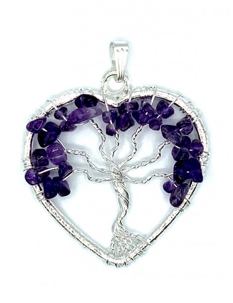 El colgante destaca por su forma de árbol de la vida, es una joya elegante, original y divertida. Diseñada con piedras naturales de Amatista. Está ensamblado a mano.