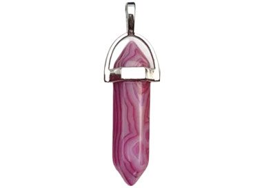 El colgante destaca por su forma de punta de doble es una joya elegante, original y divertida. Diseñada con piedras de Ágata Rosa. Está ensamblado a mano.