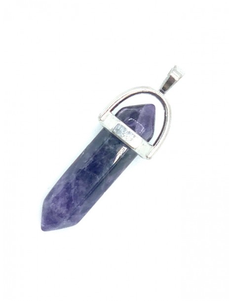 El colgante destaca por su forma de doble punta es una joya elegante, original y divertida. Diseñada con piedras de Amatista. Está ensamblado a mano.