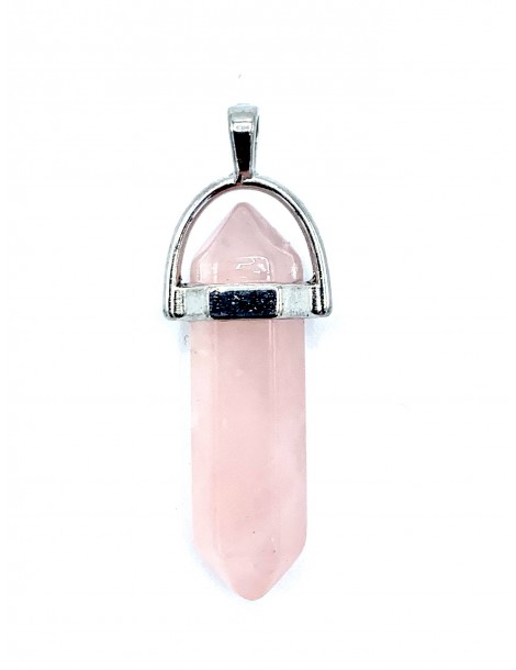 El colgante destaca por su forma de doble punta es una joya elegante, original y divertida. Diseñada con piedras de Cuarzo Rosa. Está ensamblado a mano.