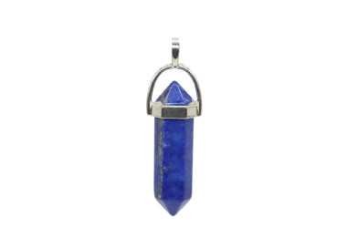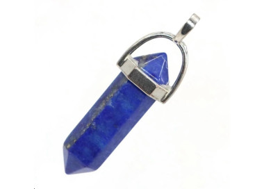 El colgante destaca por su forma de doble punta es una joya elegante, original y divertida. Diseñada con piedras naturales de Lapislázuli. Está ensamblado a mano.