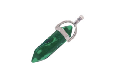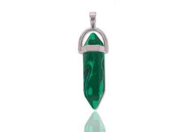 El colgante destaca por su forma de doble punta es una joya elegante, original y divertida. Diseñada con piedras de Malaquita. Está ensamblado a mano.