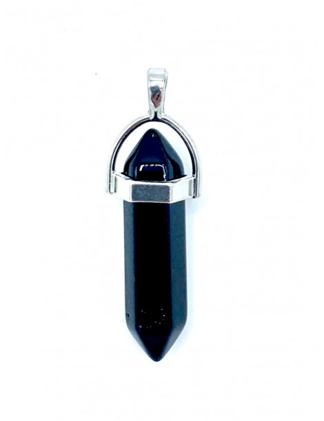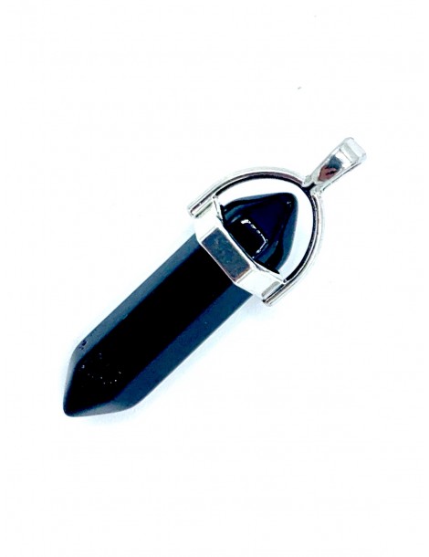El colgante destaca por su forma de doble punta es una joya elegante, original y divertida. Diseñada con piedras naturales de Turmalina Negra. Está engarzado a mano.