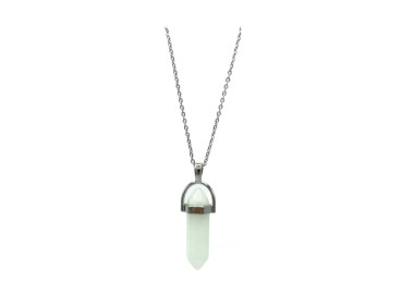 El collar destaca por su forma en doble punta, es una joya elegante, original y divertida. Diseñada con piedras naturales de Jade Verde. Está ensamblado a mano, incluye cadena de Acero Inox..