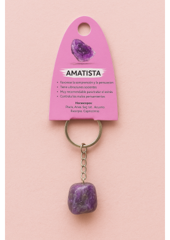 Llavero Amatista Es un elegante llavero elaborado en piedra natural de Amatista que destaca por su color violeta intenso. Características: La...
