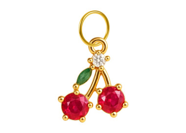El charm Cherry es una pieza de una vivacidad exquisita y un encanto lúdico. Su diseño presenta un dúo de cerezas esculpidas con gemas de un rojo profundo, cuyo corte facetado captura la luz intensamente.