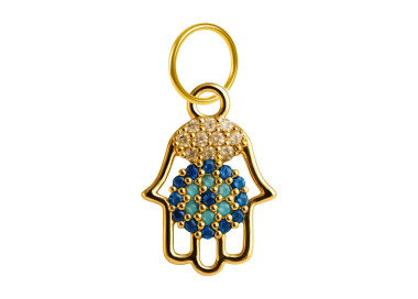 El charm Mano de Fatima es una pieza de un simbolismo ancestral y un diseño cromático vibrante. Su estructura en Acero Inox dorado presenta la icónica silueta de la Hamsa, meticulosamente ornamentada con un mosaico central de Circonitas de colores que forman un ojo protector, coronado por un delicado pavé que aporta un resplandor celestial.