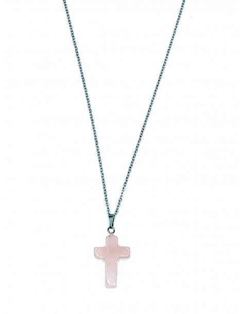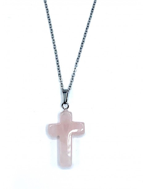 El colgante destaca por su forma de Cruz, es una joya elegante, original y divertida. Diseñada con piedras naturales de Cuarzo Rosa. Está ensamblado a mano en Acero.