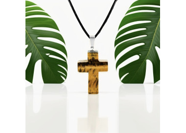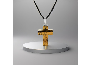 El colgante destaca por su talla en forma de cruz, es una joya elegante, original y divertida. Diseñada con piedras naturales de Ojo de Tigre. Está ensamblado a mano en Acero.