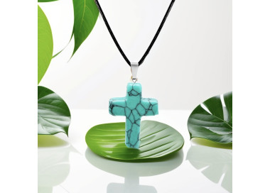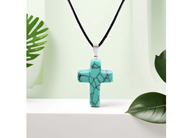 El colgante destaca por su forma de Cruz, es una joya elegante, original y divertida. Diseñada con piedras de Turquesa. Está ensamblado a mano en Acero.