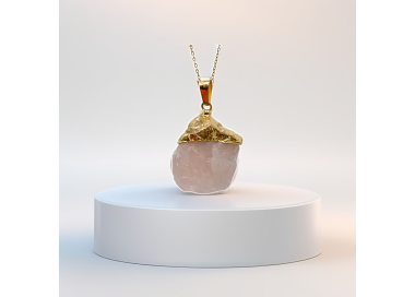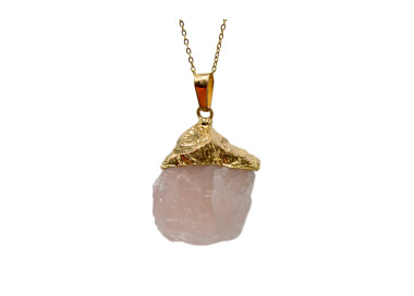 El colgante destaca por su original forma al natural sin pulir, es un colgante elegante, fino y divertido. Diseñado con piedras naturales de Cuarzo Rosa, le dará un toque especial a tu look.