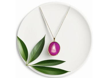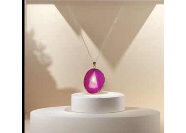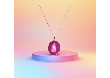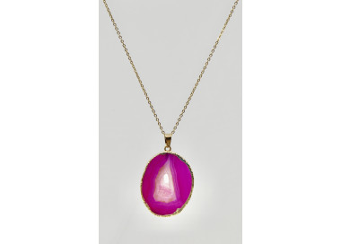 El collar destaca por su forma y color exclusivo, es una joya elegante, original y divertida. Diseñada con piedras de Ágata Rosa. Está ensamblado a mano. Incluye cadena de Acero.