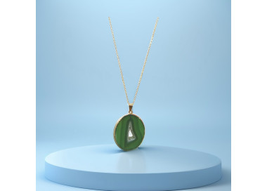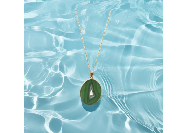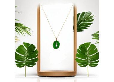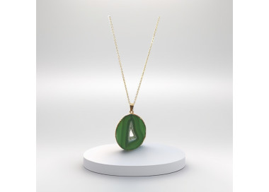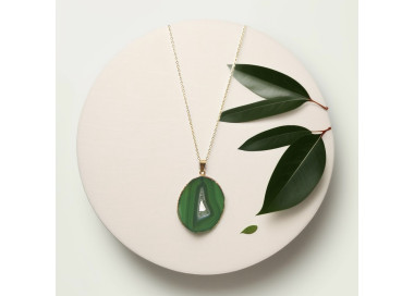 El collar destaca por su forma y color exclusivo, es una joya elegante, original y divertida. Diseñada con piedras de Ágata verde. Está ensamblado a mano. Incluye cadena de Acero.