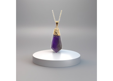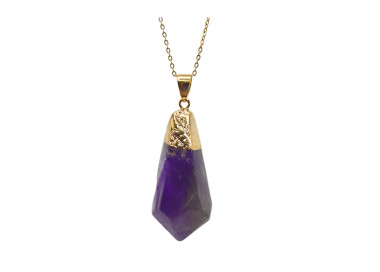 El collar destaca por su original forma de tallado al natural, es un collar elegante, fino y divertido. Diseñado con piedras naturales de Amatista, le dará un toque especial a tu look. Está ensamblado a mano en Acero inoxidable. Incluye cadena de Acero.