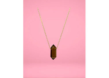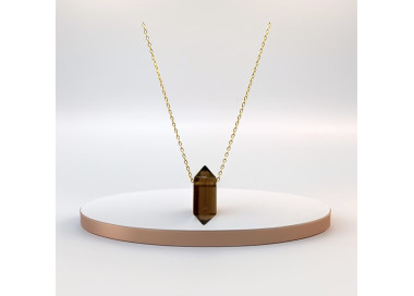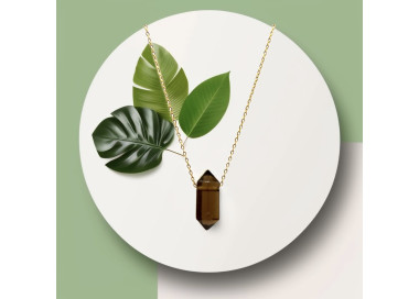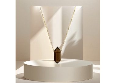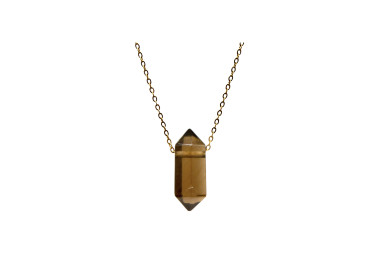 El collar destaca por su forma de doble punta, es una joya elegante, original y divertida. Diseñada con piedras naturales de Cuarzo Ahumado. Está ensamblado a mano en Acero, tanto el colgante como su cadenita.