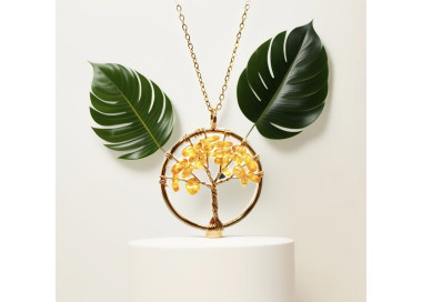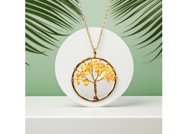 El collar destaca por su forma de Árbol de la vida, es una joya elegante, original y divertida. Diseñada con piedras naturales de Citrino. Está engarzado a mano en Acero, tanto el colgante como su cadenita.
