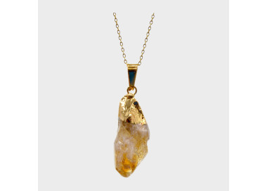 El collar destaca por su original forma al natural sin pulir, es un collar elegante, fino y divertido. Diseñado con piedras naturales de Cuarzo Citrino, le dará un toque especial a tu look. Está ensamblado a mano en Acero, tanto el colgante como su cadenita.