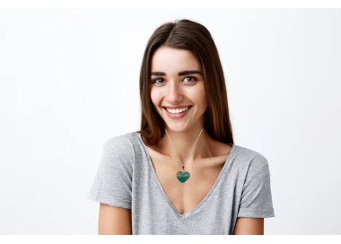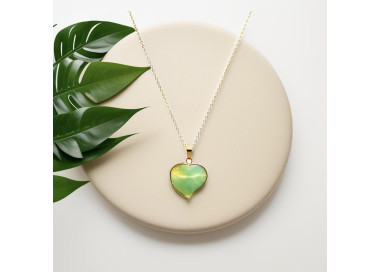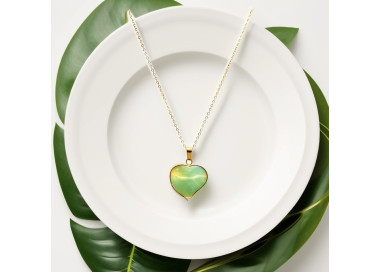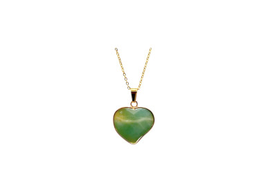El collar destaca por su talla en forma de corazón tallado, es una joya elegante, original y divertida. Diseñada con piedras de naturales de Amazonita. Está ensamblado a mano. Incluye cadena de Acero