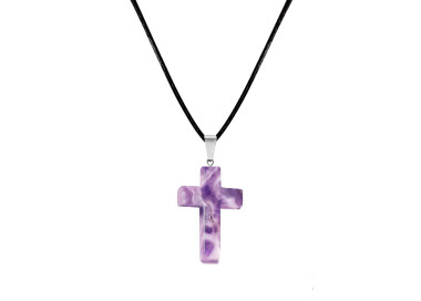 El collar destaca por su forma de Cruz, es una joya elegante, original y divertida. Diseñada con piedras naturales de Amatista. Está ensamblado a mano en Acero.