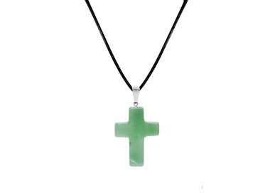 El collar destaca por su forma de Cruz, es una joya elegante, original y divertida. Diseñada con piedras naturales de Aventurina Verde. Está ensamblado a mano en Acero, incluye cordón de cuero.