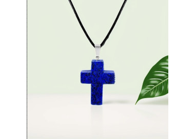El collar destaca por su forma de Cruz, es una joya elegante, original y divertida. Diseñada con piedras naturales de Lapislázuli. Está ensamblado a mano en Acero, incluye cordón de cuero.