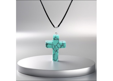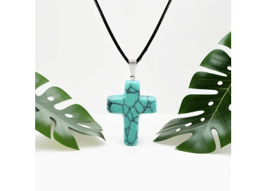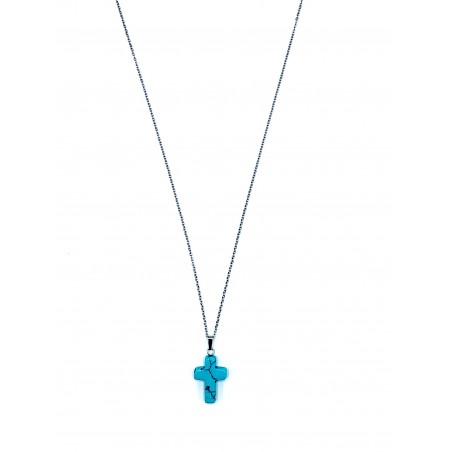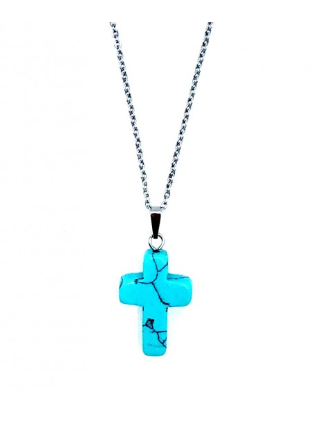 El collar destaca por su forma de Cruz, es una joya elegante, original y divertida. Diseñada con piedras de Turquesa. Está ensamblado a mano en Acero, tanto el colgante como su cadenita.
