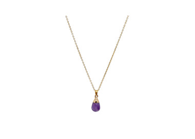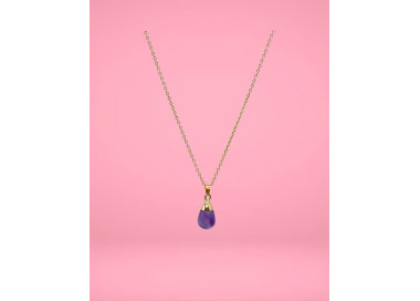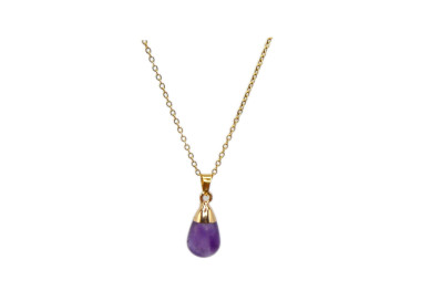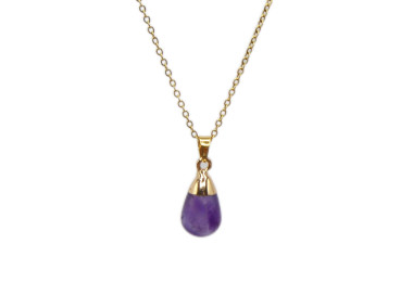 El collar destaca por su original forma de Gota, es un collar elegante, fino y divertido. Diseñado con piedras naturales de Amatista, le dará un toque especial a tu look. Está ensamblado a mano en Acero, tanto el colgante como su cadenita.