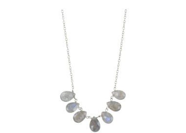 El collar destaca por su original forma de gotas, es un collar elegante, fino y divertido. Diseñado con piedras naturales Labradoritale dará un toque especial a tu look. Está ensamblado a mano y la cadena es de Plata de Ley 925.