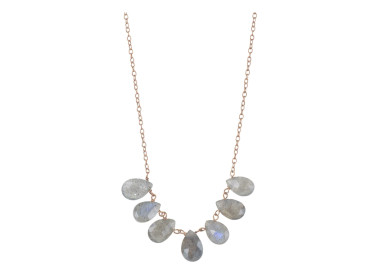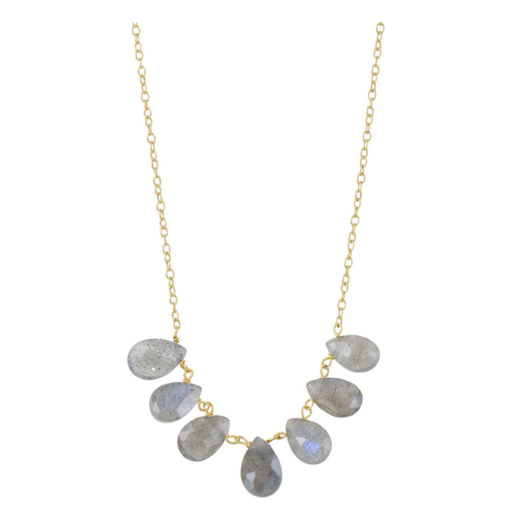 El collar destaca por su original forma de gotas, es un collar elegante, fino y divertido. Diseñado con piedras naturales Labradorita, le dará un toque especial a tu look. Está ensamblado a mano y la cadena es de Plata de Ley 925.