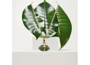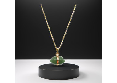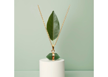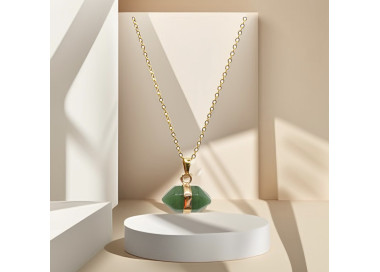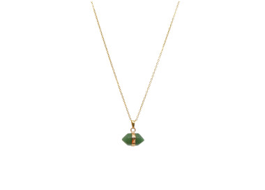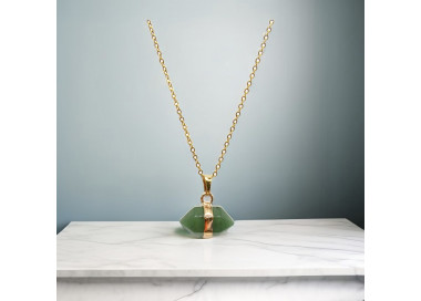 El collar destaca por su forma Hexagonal, es una joya elegante, original y divertida. Diseñada con piedras naturales de Aventurina Verde. Está ensamblado a mano. Incluye cadena de Acero.