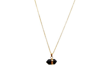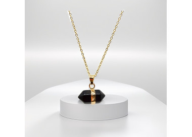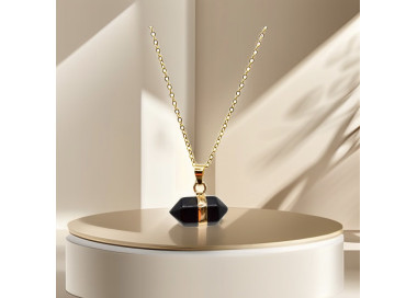 El collar destaca por su forma Hexagonal, es una joya elegante, original y divertida. Diseñada con piedras naturales de Obsidiana. Está ensamblado a mano. Incluye cadena de Acero