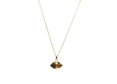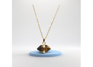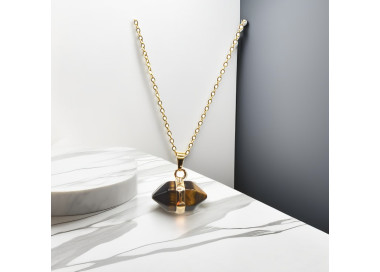 El collar destaca por su forma Hexagonal, es una joya elegante, original y divertida. Diseñada con piedras naturales de Ojo de Tigre. Está ensamblado a mano. Incluye cadena de Acero.