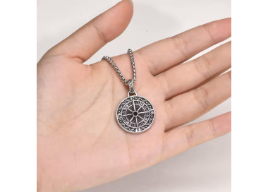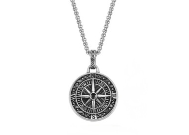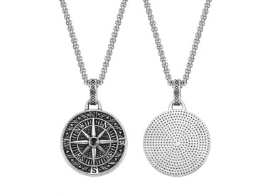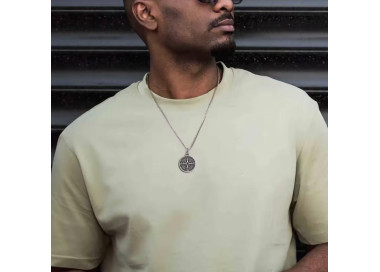 Su medallón circular en acabado plata envejecida destaca por sus detalles grabados con gran profundidad, que aportan un estilo robusto y auténtico. El punto central oscuro refuerza su carácter masculino y añade un contraste elegante que atrae la mirada. La cadena de eslabones sólidos completa una pieza diseñada para durar y acompañarte en cada desafío.