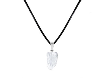 El collar destaca por su original forma de rodado natural, es fino y divertido. Diseñado con piedras naturales de Cuarzo Blanco, le dará un toque especial a tu look. Está ensamblado a mano, incluye cordón de cuero.