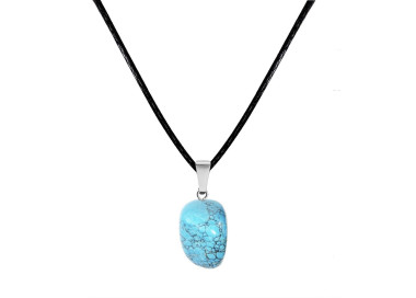 El collar destaca por su original forma de rodado natural, es fino y divertido. Diseñado con piedras de Turquesa, le dará un toque especial a tu look. Está ensamblado a mano, incluye cordón de cuero.