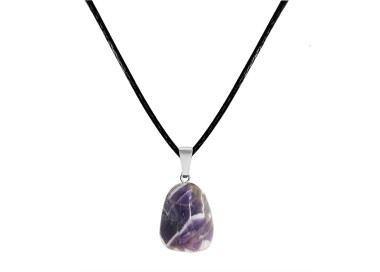 El collar destaca por su original forma de rodado natural, es fino y divertido. Diseñado con piedras naturales de Amatista, le dará un toque especial a tu look. Está ensamblado a mano, incluye cordón de cuero.