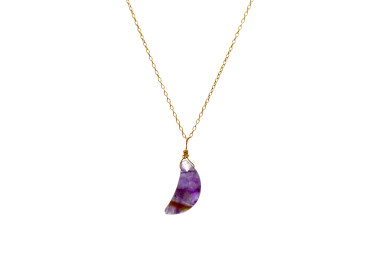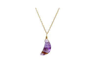 El collar destaca por su original forma de luna, es un collar elegante, fino y divertido. Diseñado con piedras naturales de Amatista, le dará un toque especial a tu look. Está ensamblado a mano y la cadena es de Plata de Ley 925.