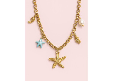 Déjate llevar por la magia del sol - Un collar que captura la alegría tropical y la frescura marina. Con charms dorados en forma de estrellas de mar, pez, concha, perla y una delicada estrella azul turquesa, es el complemento perfecto para tus looks de verano. Elaborado en Acero inoxidable dorado de alta calidad.