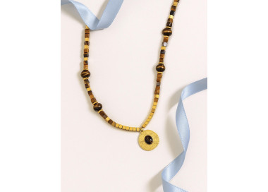 Un collar cargado de símbolos de protección, combina la calidez en tonos tierra con el resplandor del dorado, culminando en un colgante central con acabado martillado y una piedra de Ojo de Tigre que evoca la fuerza interior, protección y conexión con la naturaleza.