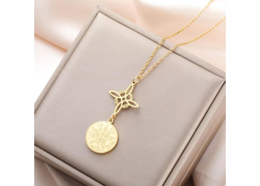 El collar está elaborado en Acero 316L antialérgico, reconocido por su durabilidad y brillo impecable, y terminado con un elegante chapado en Oro de 18 K, que aporta un toque cálido y sofisticado. Su cadena rolo de 1.4 mm y el cierre mosquetón garantizan comodidad y seguridad en el uso diario. un elegante collar de Nudo de Bruja con un acabado dorado o plateado, que revela un fascinante secreto!