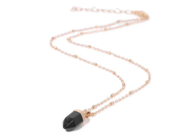 El collar destaca por su forma de punta, es una joya elegante, original y divertida. Diseñada con piedras naturales de Obsidiana. Está ensamblado a mano. Incluye cadena de Acero.
