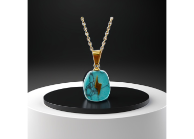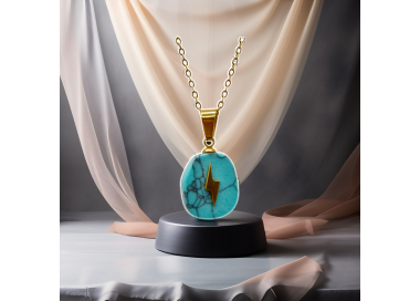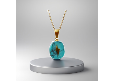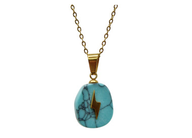 El collar destaca por su forma ovalada con un rayo dorado engastado, es un collar elegante, fino y divertido. Diseñado con piedras de Turquesa, le dará un toque especial a tu look. Está ensamblado a mano en Acero inoxidable. Incluye collar de Acero.