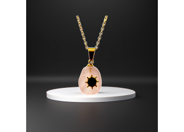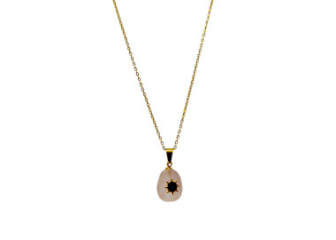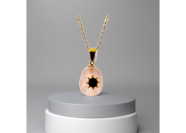 El collar destaca por su forma ovalada con un sol dorado engastado, es un collar elegante, fino y divertido. Diseñado con piedras naturales de Cuarzo Rosa, le dará un toque especial a tu look. Está ensamblado a mano en Acero. Incluye collar de Acero.