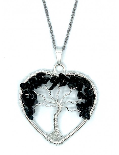 El collar destaca por su forma de Corazón, es una joya elegante, original y divertida. Diseñada con piedras naturales de Turmalina negra. Está ensamblado a mano, tanto el colgante como su cadenita.