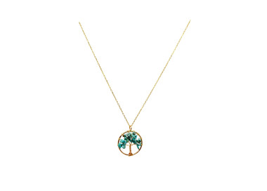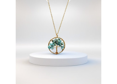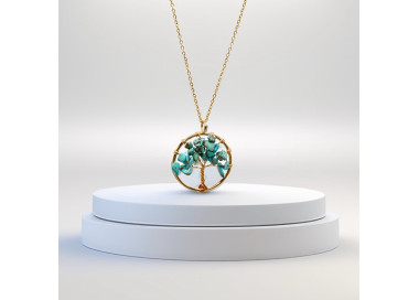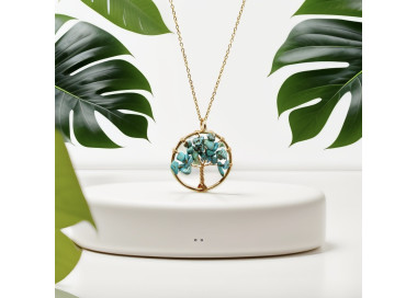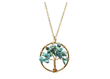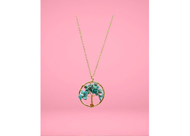 El collar destaca por su forma de árbol de la vida es una joya elegante, original y divertida. Diseñada con piedras naturales de Turquesa. Está engarzado a mano en Acero, tanto el colgante como su cadenita.