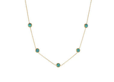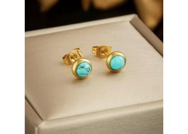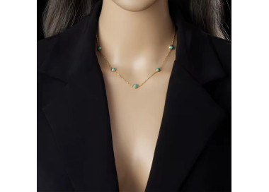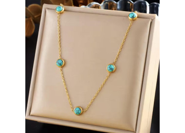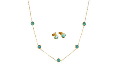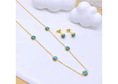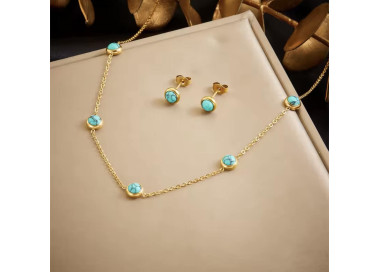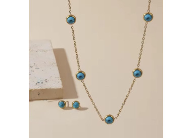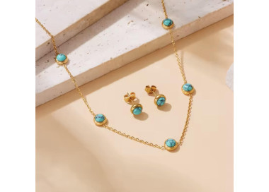 Una fusión perfecta entre elegancia y sofisticación, un conjunto que combina la tendencia actual con piedras naturales de Turquesa. Compuesto por dos piezas: Collar y unos elegantes pendientes, ambos elaborados en Acero inoxidable dorado de alta calidad.