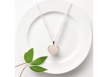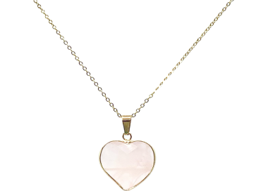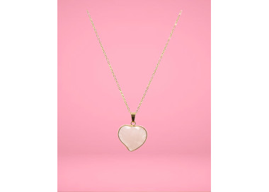 El collar destaca por su talla en forma de corazón tallado, es una joya elegante, original y divertida. Diseñada con piedras naturales de Cuarzo Rosa. Está ensamblado a mano en Acero, tanto el colgante como su cadenita.
